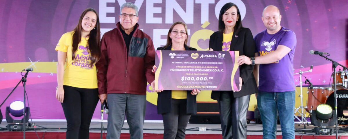 Para respaldar la Colecta Nacional 2023 del Teletón, el presidente municipal de Altamira, Dr. Armando Martínez Manríquez y su esposa, la C.P. Rossy Luque de Martínez, Presidenta del Sistema DIF local, hicieron entrega al Ing. Baldomero López Zamora, Director General del CRIT Teletón Tamaulipas un cheque por valor de cien mil pesos durante el evento que esta organización sin fines de lucro realizó en la Unidad Deportiva de la ciudad.